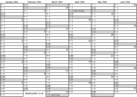 1564 calendar