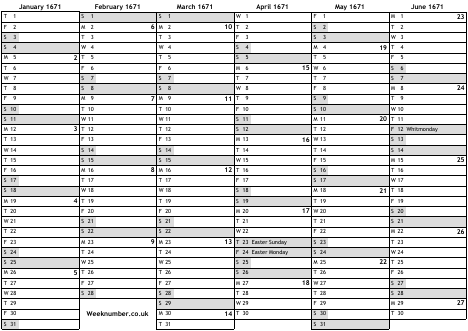 1671 calendar