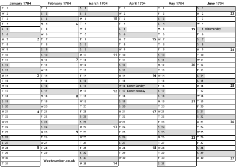 1704 calendar