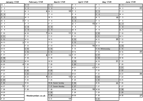 1749 calendar