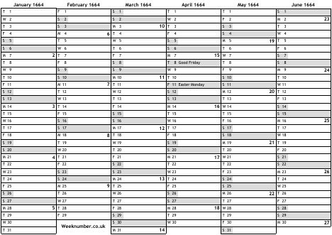 1664 calendar