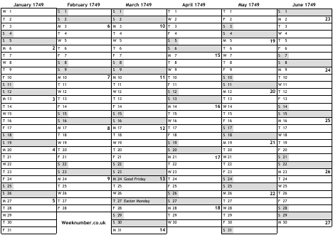 1749 calendar